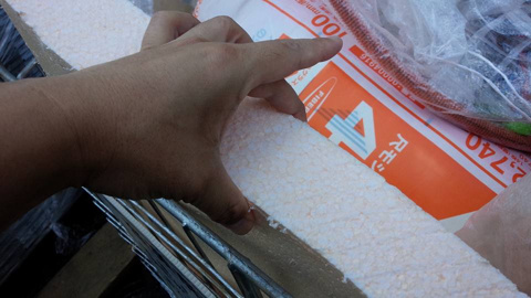 ↑ 無造作に捨ててあった断熱材の断片です。柱と柱の間にきっちりと採寸して押し込んでしまいます。大昔はこの断熱材そのものがございませんでした。今は大量のグラスウールを押し込んでしまうか、発泡スチロールを押し込むかしています。これだけの断熱材が入っていると、建物の断熱性も相当に信頼できますね。